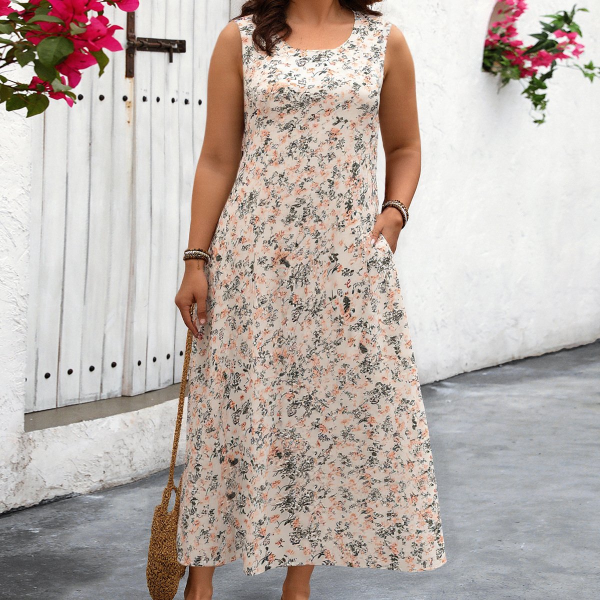 This stunning A-Line maxi dress features a beautiful floral print that embodies fresh and feminine elegance. Made from 95% polyester, it’s lightweight and perfect for warm weather. The sleeveless design and U-neckline make it a great choice for summer outings or casual gatherings.