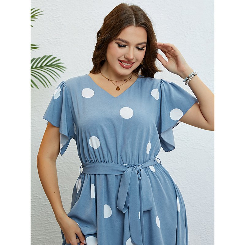 This stylish V-neck dress features a flattering tie waist design, perfect for a chic summer look. The cute polka dot pattern adds a touch of fun and femininity to your wardrobe. Made from high-quality polyester, this dress offers comfort and durability for everyday wear. Its A-line silhouette and ruffled sleeves create a fresh, sweet look that complements various occasions.
